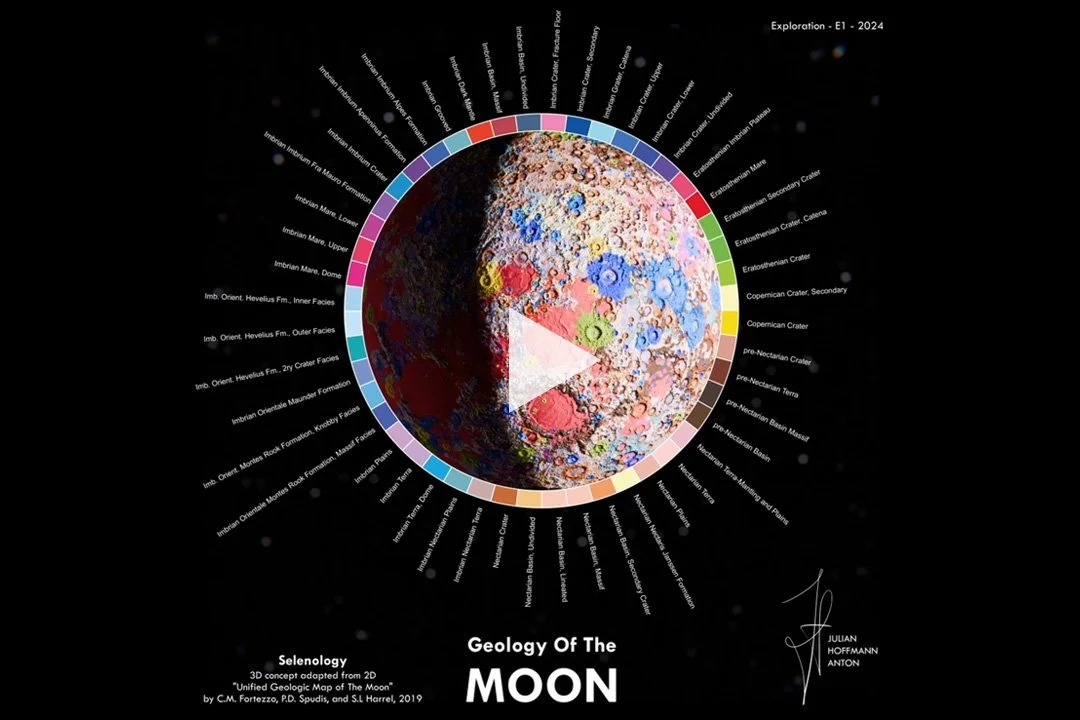 A concept visualization based on the "Unified Geologic Map of The Moon" by C.M. Fortezzo, P.D. Spudis, and S.L Harrel, 2019. This piece highlights a wide variety of geological features on our celestial neighbour.